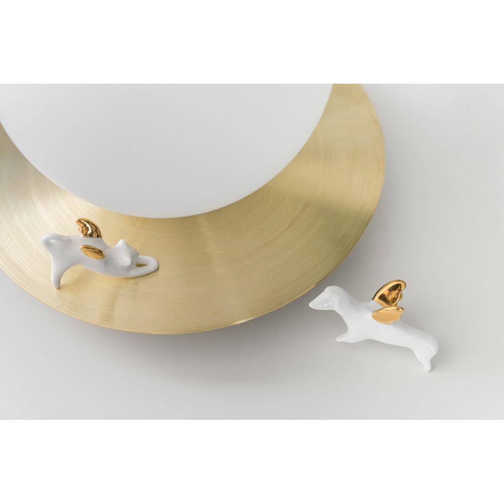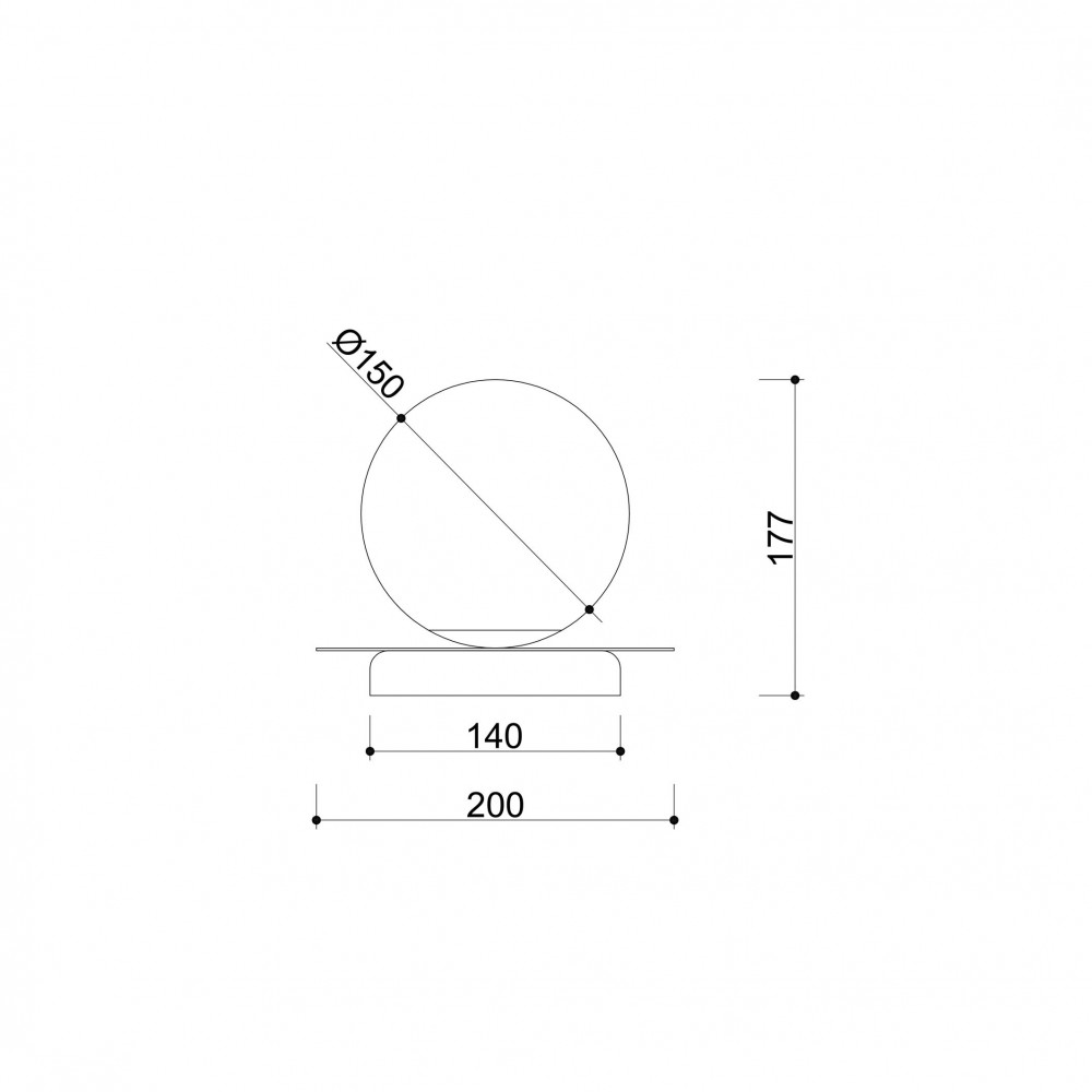 Den mjölkvita sfäriska lampskärmen med en diameter på 15 cm vilar på en borstad, lackerad mässingsskiva som försiktigt reflekterar ljuset och ger lampan en elegant, lyxig karaktär. Helheten kröns av en låg svart bas med en strukturerad finish som ger lampan en grafisk lätthet.