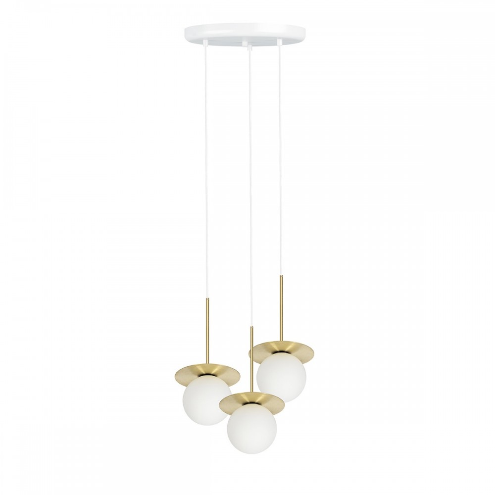 - taklampa trippel plafond - färg borstad mässing, vit (Signal White RAL 9003) - material mässing, metall, glas - längd 30cm - bredd 30cm - höjd 43cm - total längd 160cm - 3x diffusor i mjölkvitt glas ⌀15cm - vit takram ⌀30cm - 3x mässingsskiva ⌀20cm - 3x flätad vit polyestersladd - G9-gänga - max 3x12W LED - IP20