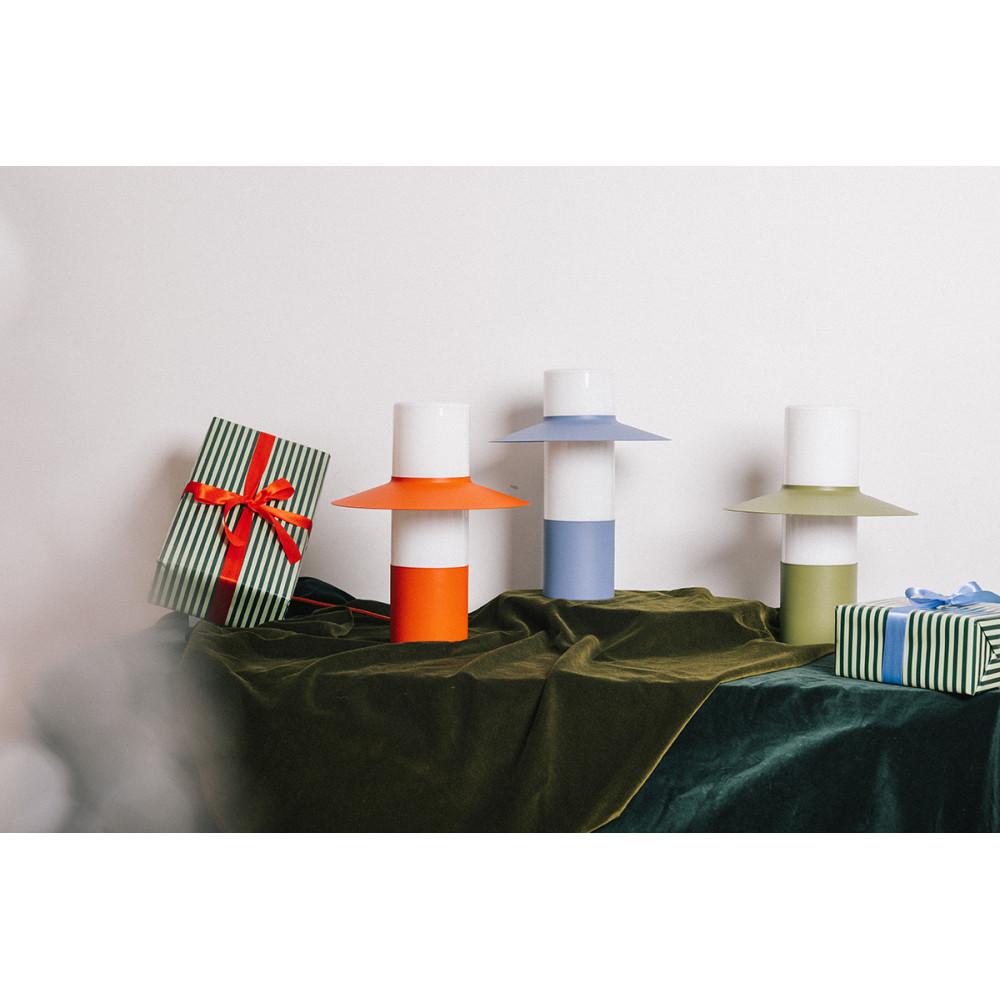 Lampskärmen i metall med sin mjuka, rundade form finns i färgerna röd-orange RAL 2002, svart RAL 9005, vit RAL 9003, oliv RAL 6013, blå RAL 5014 och är placerad på en smal, minimalistisk metallfot.