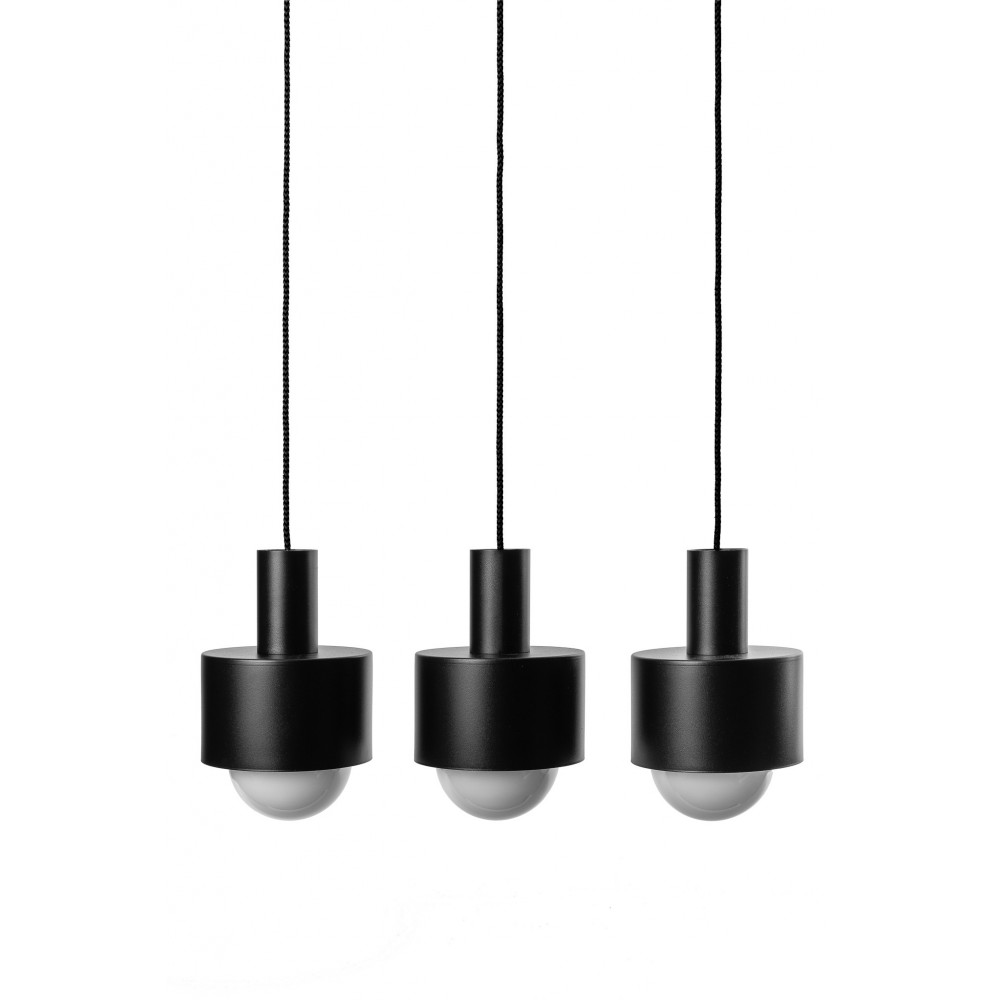 Lampan ENKEL 3L består av tre metallampskärmar med en diameter på 17 cm, var och en pulverlackerad i en djup svart färg (Jet Black RAL 9005) med en matt, strukturerad yta. Hela lampan är upphängd i 107,5 cm långa svarta textilkablar, som gör det möjligt att justera höjden på upphängningen - från en kompakt form till ett slående, lågt hängande arrangemang.