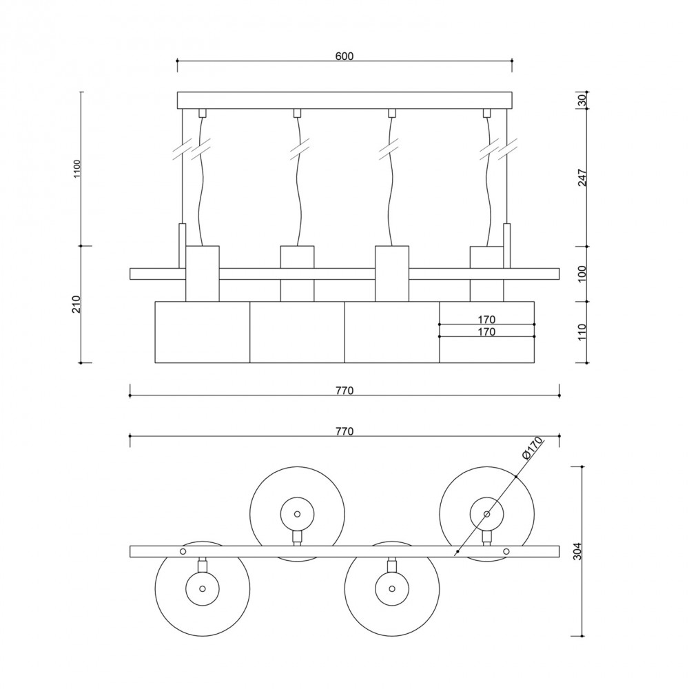 Helheten stöds av en 60 cm lång takstång, som visuellt organiserar kompositionen och ger lampan en harmonisk rytm. Lampans totala längd är maximalt 131 cm - tack vare de justerbara pendlarna är det enkelt att anpassa den till rummets höjd och önskad ljuseffekt.