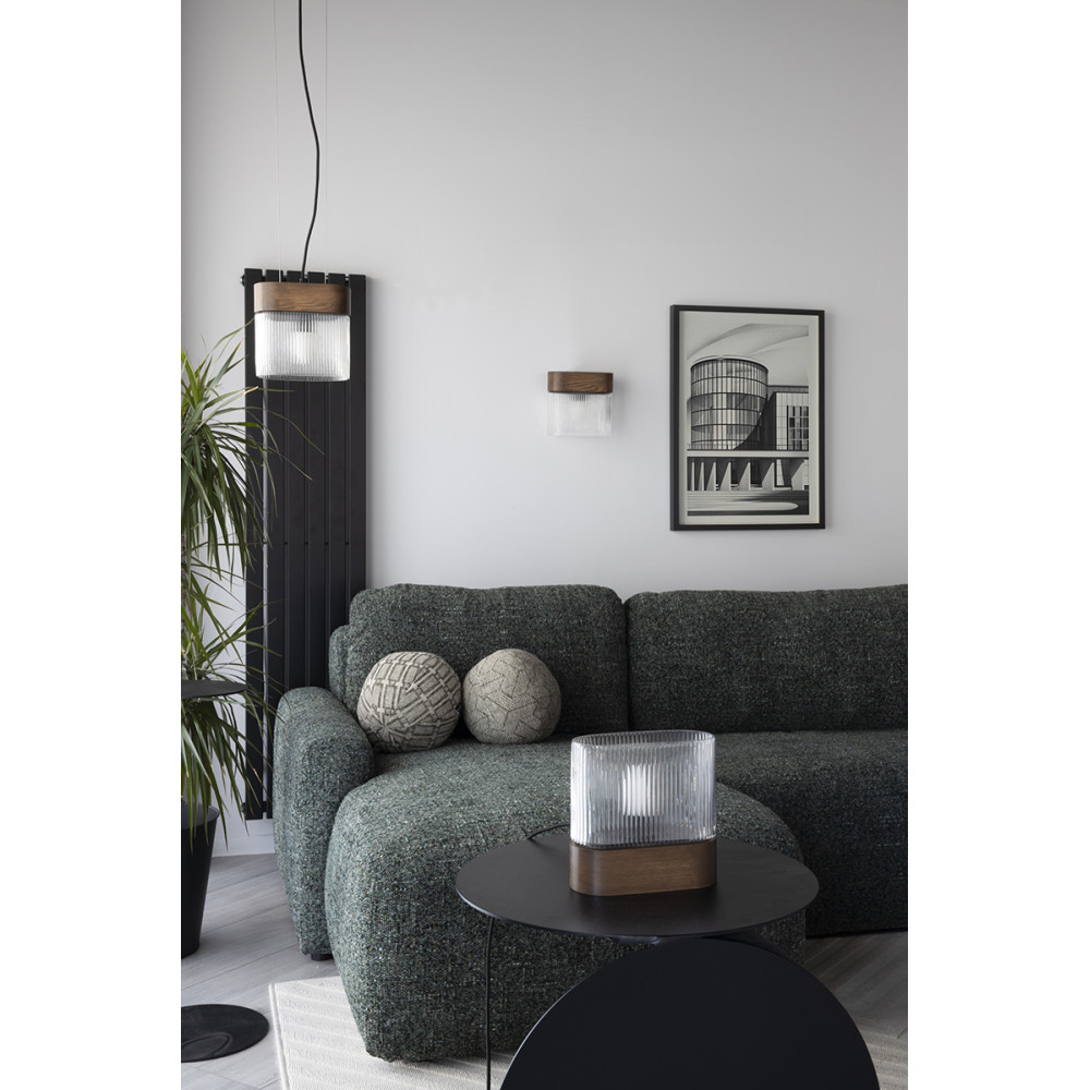 I centrum för kompositionen står den räfflade glasdiffusorn, vars vertikala spår subtilt sprider ljuset och skapar ett delikat spel av skugga och glöd på ytorna. Den kompletteras av en naturlig träbas som inte bara stabiliserar strukturen utan också värmer upp uppfattningen av lampan - både visuellt och känslomässigt. Lampans mått är 20,5 x 9,3 x 19 cm.