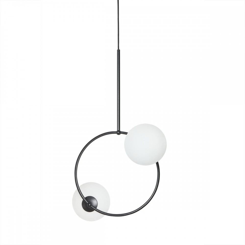 - taklampa, pendellampa - svart färg (Jet Black RAL 9005) - material metall, glas - längd 35,2cm - bredd 31,6cm - höjd 66cm - total längd 150cm - 2x mjölkvit glasdiffusor ⌀15cm - svart takfäste ⌀12cm - svart ram ⌀32cm - flätad svart polyestersladd - G9-gänga - max 2x12W LED - IP20