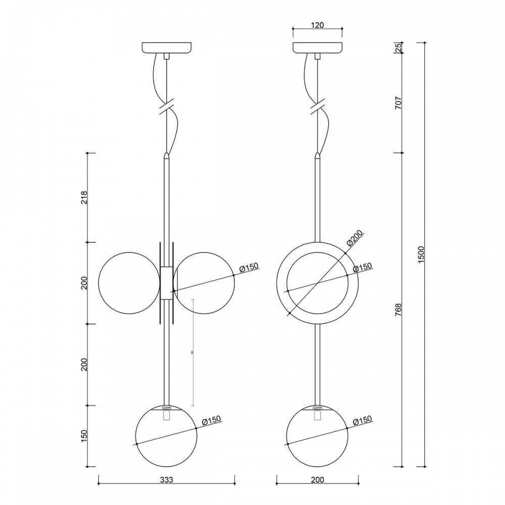 - takmonterad lampa - längd 150 cm - tre lampskärmar i matt vitt glas med en diameter på 15 cm - metallram och takram målade i strukturell svart färg - svart polyesterfläta - tvåledarkabel 2 X 0,75mm2 - max 3x12W.