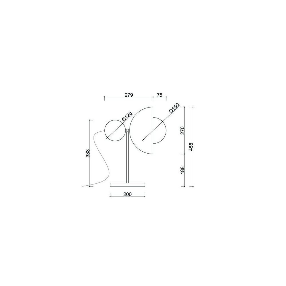 Lampan är 45,8 cm hög och 35,4 cm bred. En robust metallfot (⌀20 cm) bär upp en smal ram på vilken en halvklotformad metallskärm, en askträkula och en vit glasskärm med en diameter på 15 cm är placerade. Den flätade polyesterkabeln är 150 cm lång och färgmatchad med helheten.