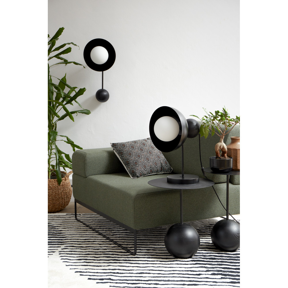 -bordslampa - svart (Jet Black RAL 9005) - material metall, glas, askträ - längd 35,4cm - bredd 27cm - höjd 45,8cm - metallfot ⌀20cm - svart ram - vit glasdiffusor ⌀15cm - svart flätad polyestersladd 150cm - svart metall halvklotformad lampskärm - askträsfär - G9-gänga - max 12W - IP20