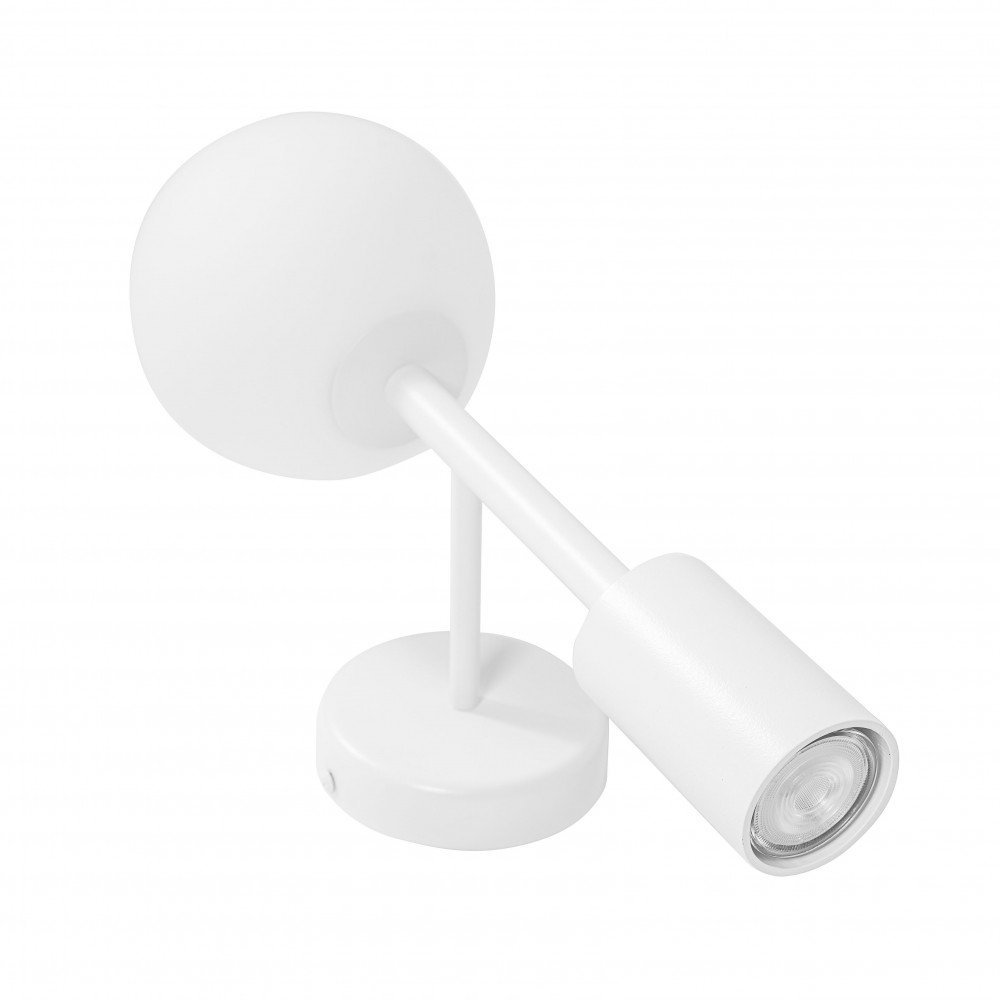 Lampans överdel består av en sfärisk skärm i mjölkvitt glas med en diameter på 15 cm, som sprider ljuset jämnt och skapar en varm och stämningsfull atmosfär. Under denna sitter en metallspot i lampans färg med en diameter på 6 cm - ett fast, orörligt element med riktat ljus. Även om spotlighten inte är justerbar ger dess placering en balanserad och funktionell spotbelysning av det valda området.