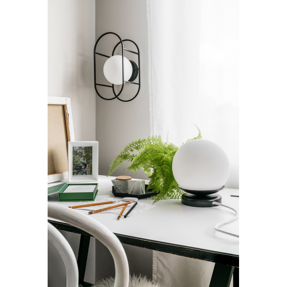 Lampskärmen är i fokus - en klassisk glaskula med en diameter på 20 cm i en mjölkaktig finish, som vilar på en låg metallfot. Tack vare sina nätta proportioner blir lampan visuellt lätt samtidigt som den är stabil och praktisk.