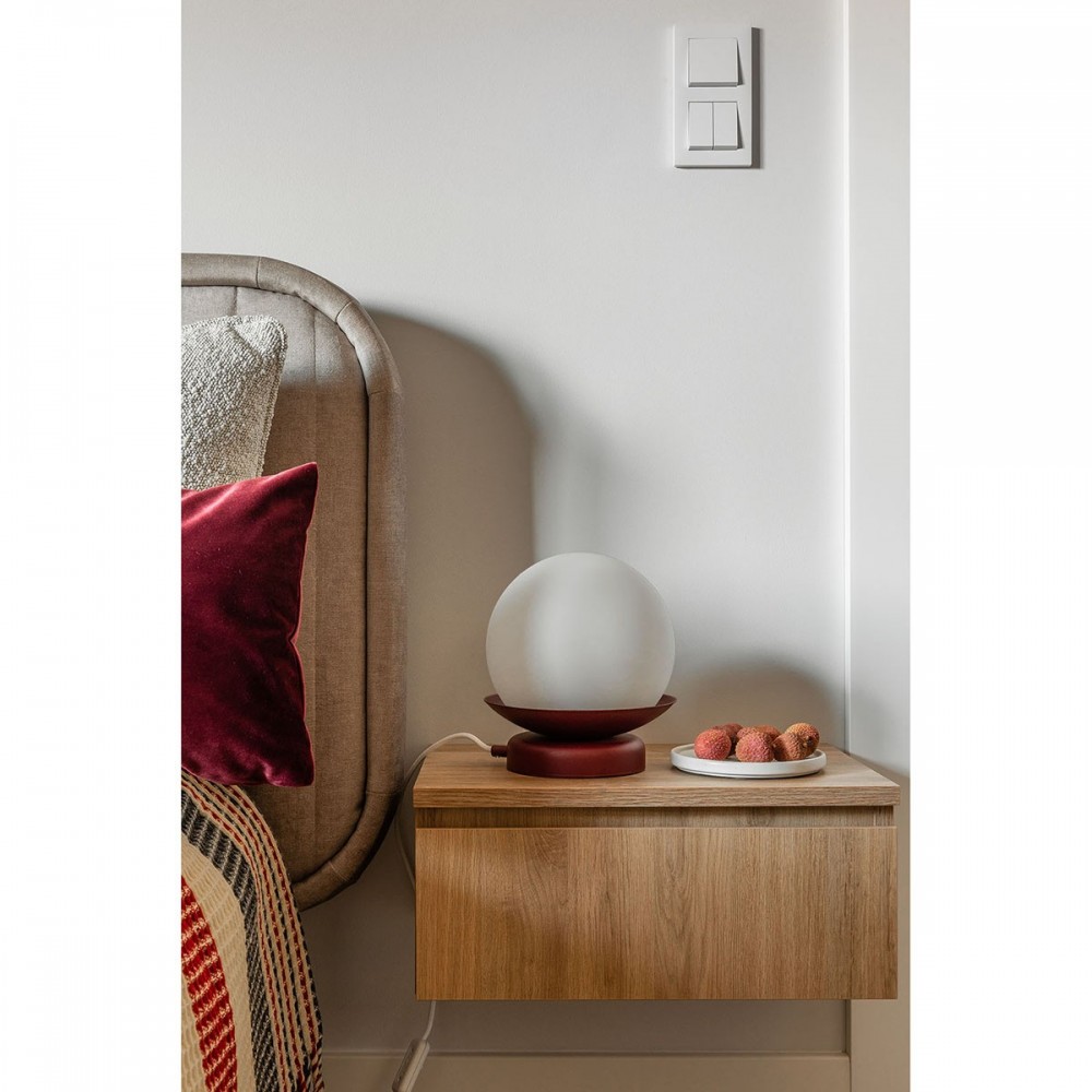 - bordslampa - vinröd färg (Purple Red RAL 3004) - material metall, glas - längd 20 cm - bredd 20 cm - höjd 22,5 cm - diffusor i mjölkvitt glas ⌀20 cm - bas målad i strukturell vinröd färg - flätad vit polyestersladd 150 cm - vit stickkontakt och strömbrytare - E27-gängad - max 15W LED - IP20
