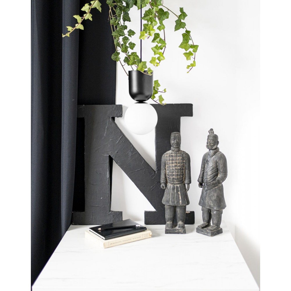 Luoti-lampan består av en pulverlackerad metallstomme och en glasskärm i en mjölkaktig finish. Den skira sfären (⌀15 cm) kontrasterar mot den massiva cylindriska armaturen och skapar en sammanhängande, modern duo. Hela lampan är upphängd i en flätad polyesterkabel (98,5 cm). Ljuskällan är en utbytbar LED-lampa med G9-sockel (max 12W), vilket gör att ljusintensiteten enkelt kan justeras efter behov.