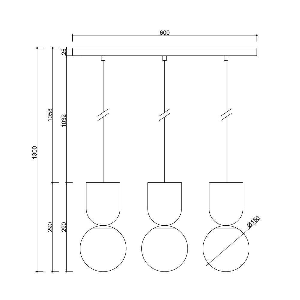 Den totala höjden på 130 cm gör det enkelt att passa in i interiörer med olika höjd. Den solida takstången ger en stabil bas för de tre överhängen, samtidigt som den städar upp kompositionen och underlättar installationen.