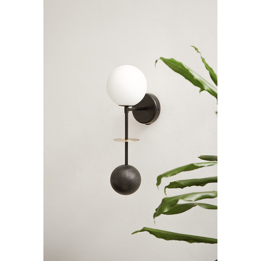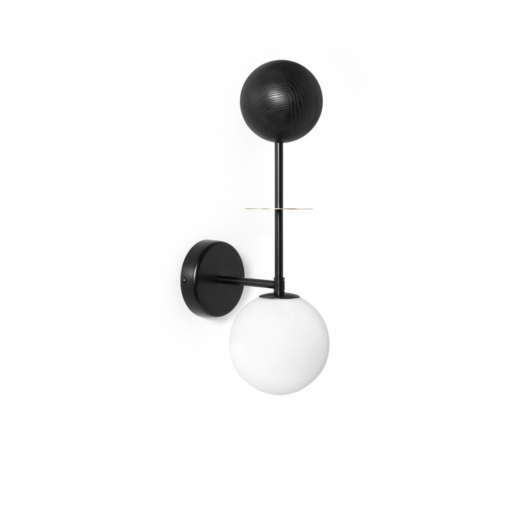 -vägglampa, vägglampa -svart, vit, mässing - material metall, trä, mässing, glas - höjd 50cm - bredd 15cm - djup 22cm - vit glaslampskärm ⌀15cm - mässingselement ⌀10cm - askkulor ⌀12cm - svart metallhölje ⌀12cm - tråd G9 - max 12W - IP20