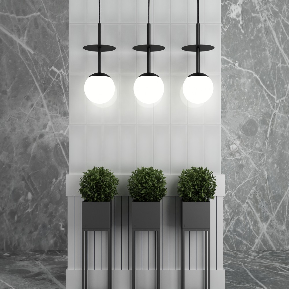 - taklampa - längd 160cm - kabellängd 110cm - glasdiffusor matt vit fi 20cm - takram strukturlackad svart fi 12cm - metallskiva fi 20cm - tvåledarkabel 2 X 0,75mm2 i svart polyesterfläta - max 15W - E27-gängad
