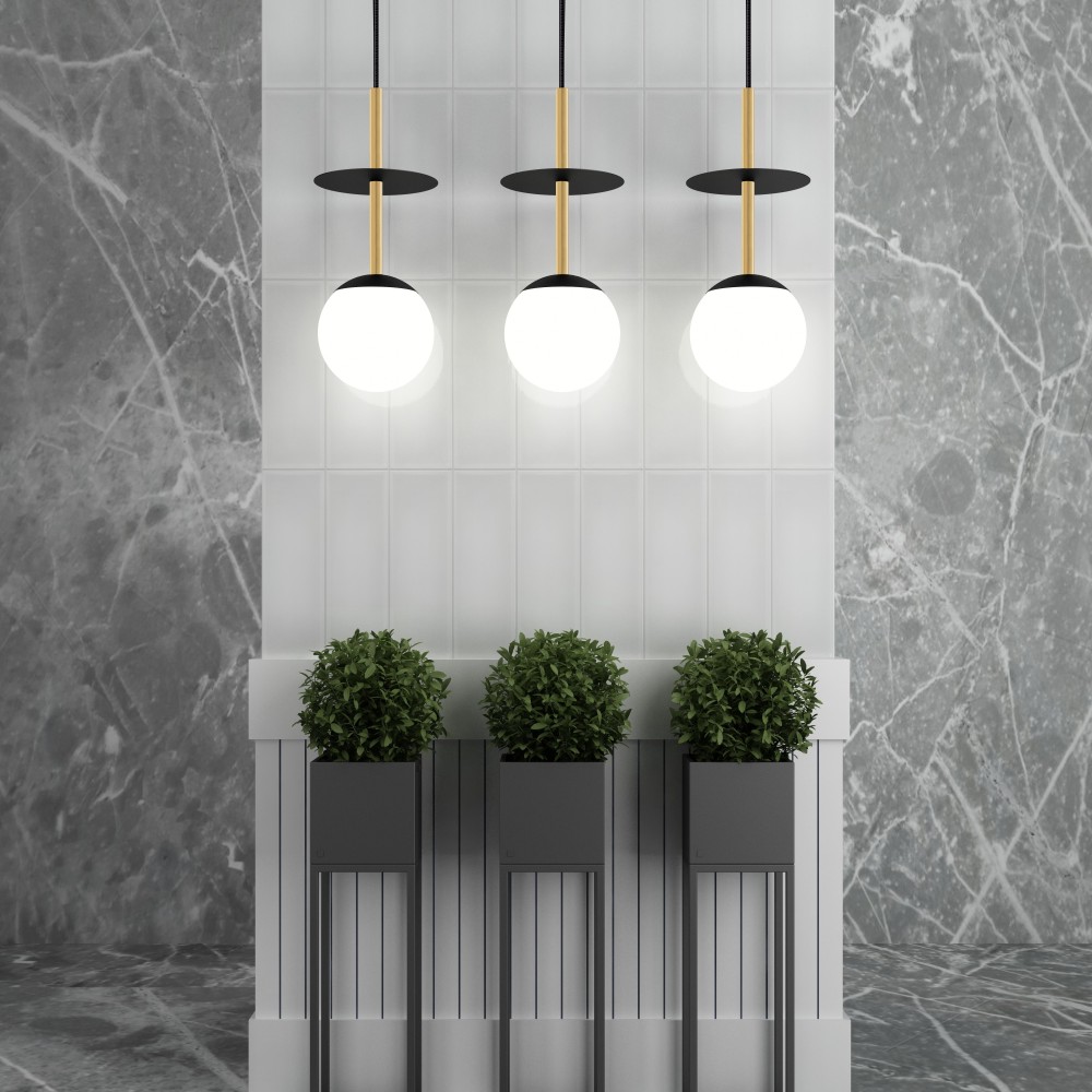 - taklampa - längd 160cm - kabellängd 110cm - glasdiffusor matt vit fi 20cm - takgaller strukturlackad svart fi 12cm - metallskiva fi 20cm - mässingsrör - tvåledarkabel 2 X 0,75mm2 i svart polyester - max 15W - tråd E27