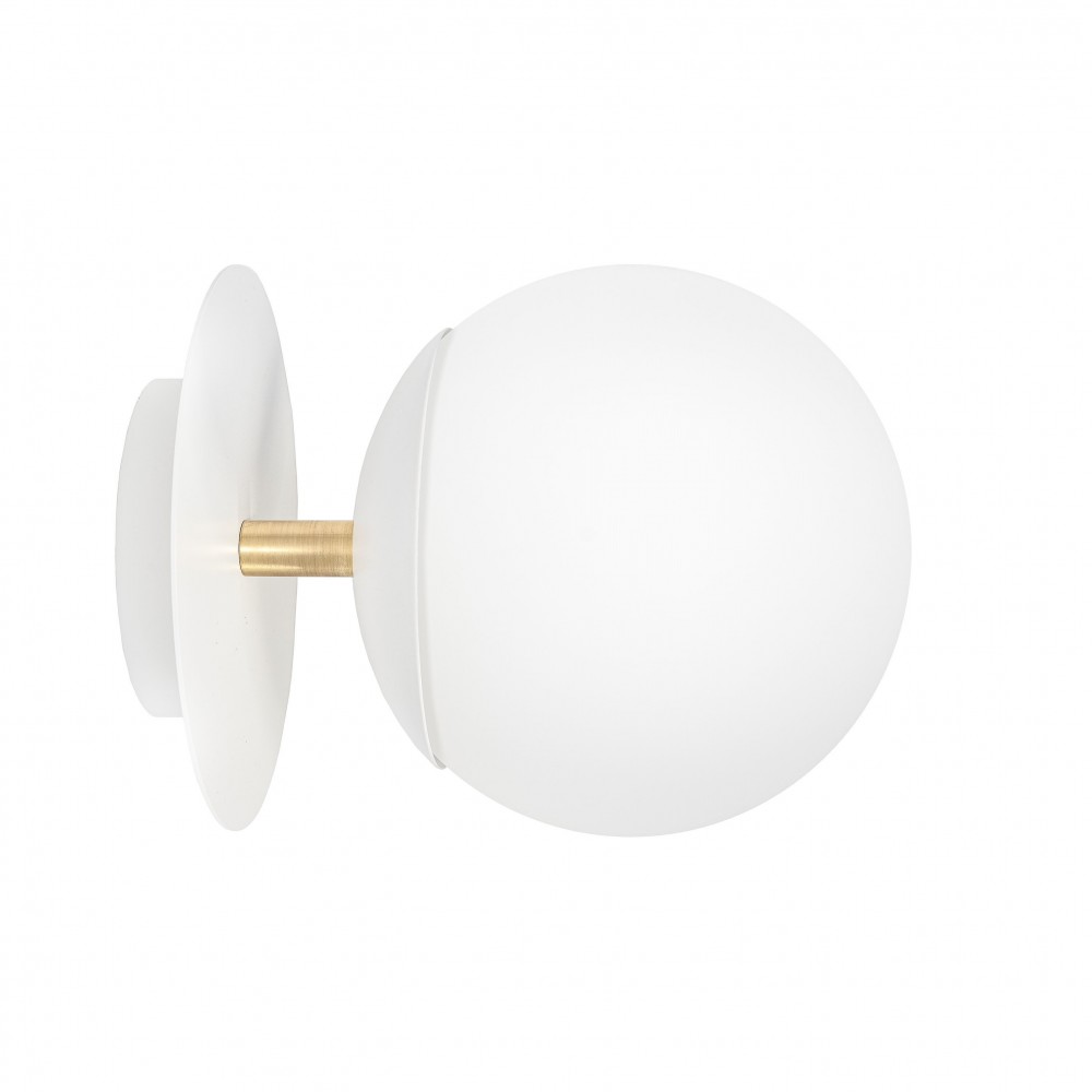 - vägglampa / väggfäste / plafond - metall / mässing / glas - vit / guld / vit - höjd 20cm - djup 27cm - diameter 20cm - diffusor i frostat vitt glas fi 20cm - strukturellt vitlackerat väggfäste fi 14cm - metallskiva fi 20cm - tvåledarkabel 2 X 0,75mm2 - gänga E27 - max 15W