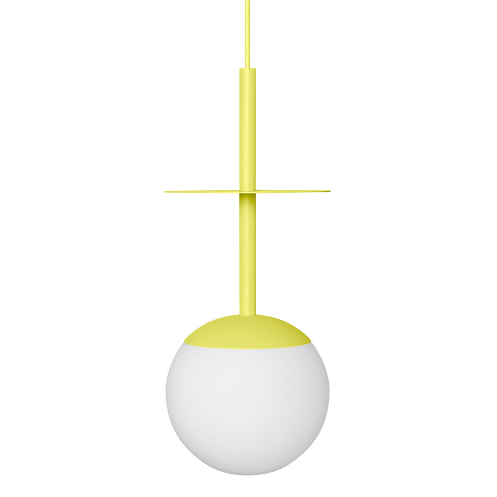 - taklampa, pendellampa - material metall, glas - färg gul (Sulfur Yellow RAL 1016) - längd 160cm - kabellängd 110cm - glasdiffusor matt vit fi 20cm - takgaller målad strukturell gul fi 12cm - metallskiva fi 20cm - tvåledarkabel 2 X 0,75mm2 i gul polyesterfläta - tråd E27 - max 15W - IP20