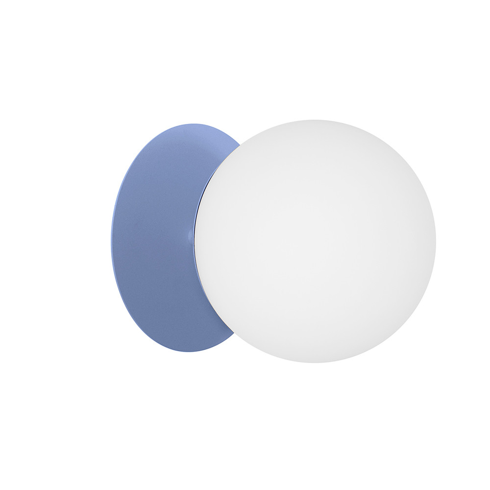 -vägglampa, väggfäste, plafond - material metall, glas - färg blå (Pigeon Blue RAL 5014) - längd 26,6cm - bredd 20cm - höjd 20cm - matt vit glasdiffusor fi 20cm - strukturellt blålackerat väggfäste fi 14cm - metallskiva fi 20cm - tvåledarkabel 2 X 0,75mm2 - gänga E27 - max 15W - IP44