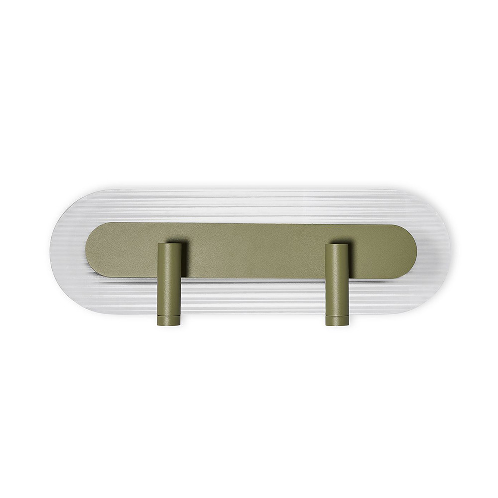 - vägglampa, vägglampa - färg olivgrön (Reed Green RAL 6013) - material metall, glas - längd 4,3cm - bredd 48,8cm - höjd 15,6cm - kupa i korrugerat glas med dekorativt element i oliv - 2x justerbar reflektor 2,1W - olivgrönt metallhölje 39,8cm x 6,8cm - inbyggd LED - effekt 4,8W - IP20