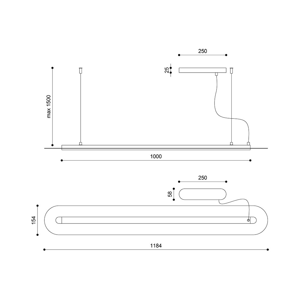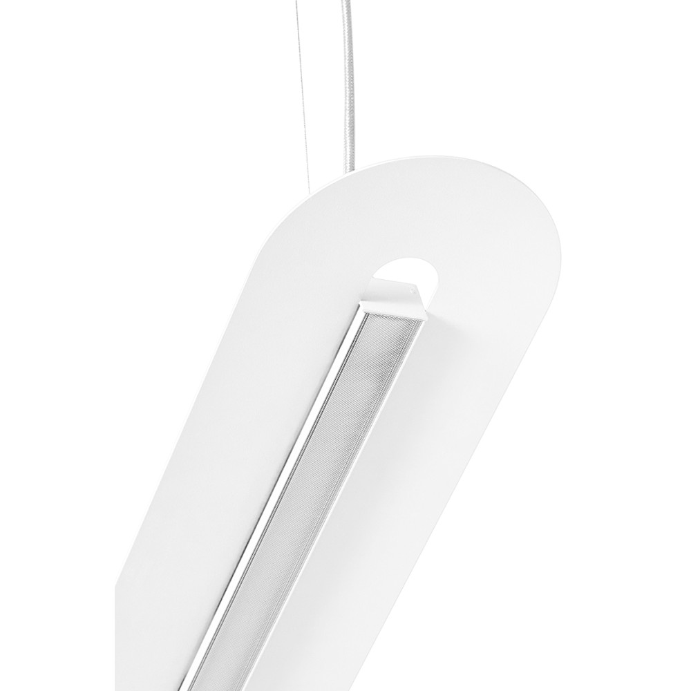 - taklampa, pendellampa - färg vit (Signal White RAL 9003) - material metall - längd 118,4cm - bredd 15,4cm - höjd 5cm - total längd 150cm - vit polyesterflätad kabel 180cm - 2x stålkabel 150cm - vit metall takgaller 25cm x 5,8cm - inbyggd LED - effekt 24W - IP20