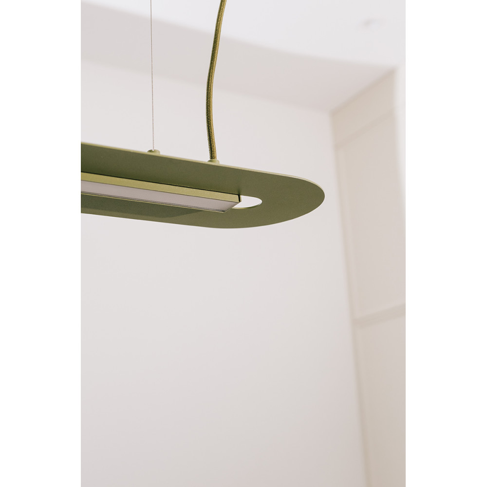 Lampkroppen är tillverkad av metall i färger från UMMO-paletten: vit RAL 9003, svart RAL 9005, rödorange RAL 2002, oliv RAL 6013, vilket ger den en modern och universell karaktär. Lampan är utrustad med en integrerad 24W LED-ljuskälla, som finns i två färgtemperaturer: 3000K eller 4000K. Detta gör det möjligt att anpassa belysningen till individuella behov och önskemål. Lampans mått är: 118,4 x 15,4 x 5 cm. Den är upphängd i tunna stålvajrar, vilket ytterligare framhäver dess lätta och fina karaktär. Den totala längden på upphängningen är 150 cm, vilket gör att den kan användas i olika utrymmen.