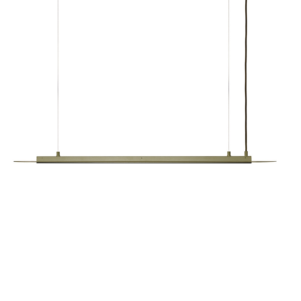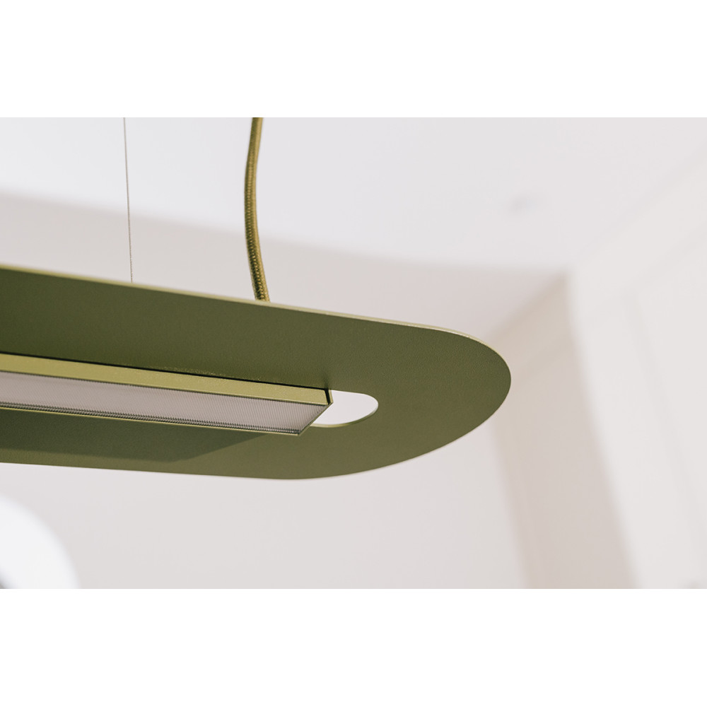 - taklampa, pendellampa - färg olivgrön (Reed Green RAL 6013) - material metall - längd 118,4cm - bredd 15,4cm - höjd 5cm - total längd 150cm - olivgrön polyesterflätad kabel 180cm - 2x stålkabel 150cm - olivgrön metall takskydd 25cm x 5,8cm - inbyggd LED - watt 24W - IP20