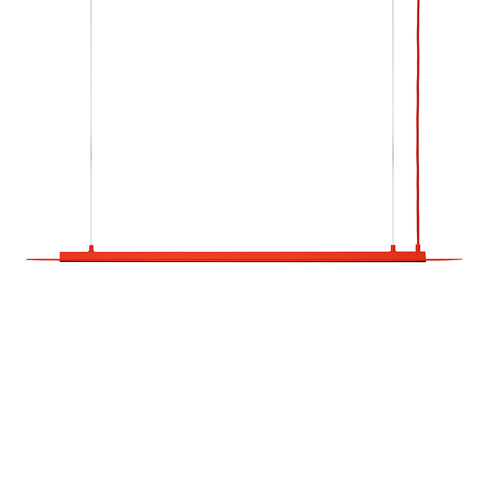 - taklampa, pendellampa - färg röd-orange (Vermilion RAL 2002) - material metall - längd 138,4cm - bredd 15,4cm - höjd 5cm - total längd 150cm - röd-orange polyesterflätad kabel 180cm - 2x stålkabel 150cm - röd-orange metalltakgaller 25cm x 5,8cm - inbyggd LED - effekt 28,8W - IP20