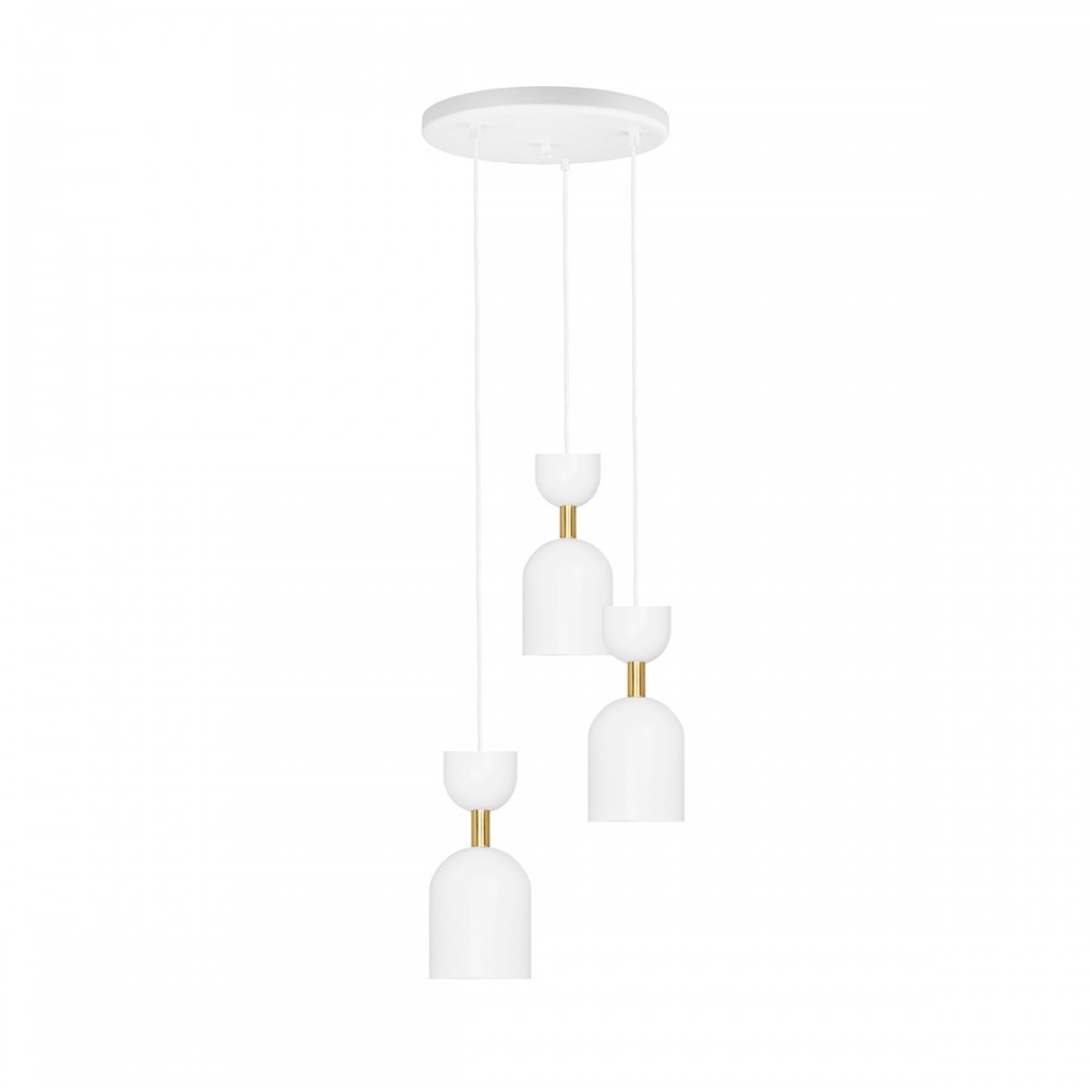 -trippel taklampa, plafond -metall -vit / mässing - lampans längd160cm -bredd 30cm - 3x metall lampskärm i strukturvit fi 11cm - dekorativt mässingsrör -takgaller i strukturvit fi 30cm - tvåledarkabel 2 X 0,75mm2 i vit polyesterfläta - kabellängd 90cm, 110cm, 130cm - ingen ljuskälla - GU10 tråd - max.30W