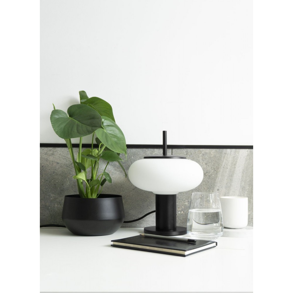 - bordslampa - metall / glas - svart / vit - höjd 28,5 cm - diameter 22 cm - diffusor i frostat vitt glas fi 22 cm - strukturell svartlackerad fot fi 12 cm - 2 X 0,75mm2 dubbelkärnig kabel i svart polyesterfläta - 150 cm lång - svart kontakt och strömbrytare - E27-gänga - max 15W