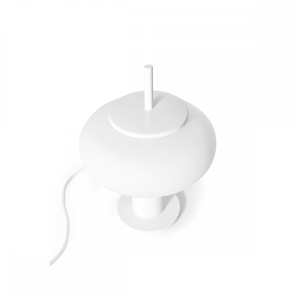 - bordslampa - metall / glas - vit - höjd 28,5 cm - diameter 22 cm - diffusor i frostat vitt glas fi 22 cm - strukturell vitlackerad fot fi 12 cm - tvåledarkabel 2 X 0,75mm2 i vit polyesterfläta, 150 cm lång - vit kontakt och strömbrytare - E27-gänga - max 15W