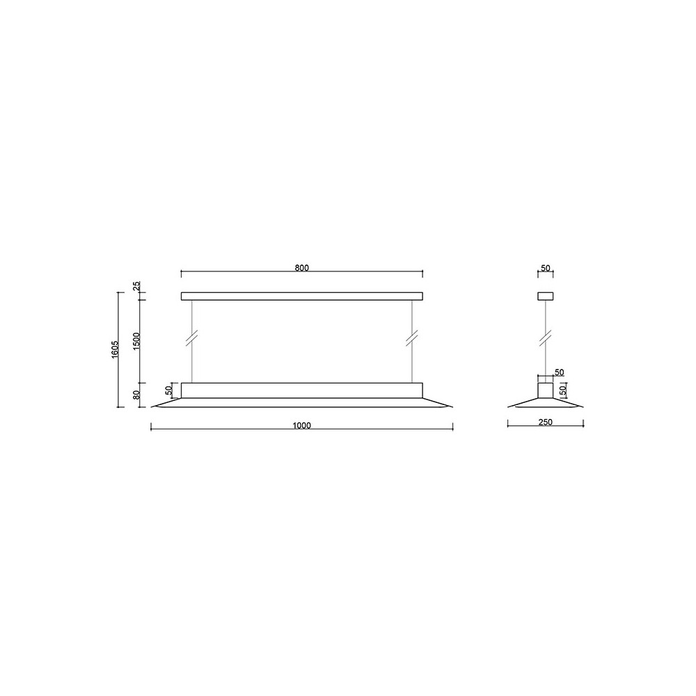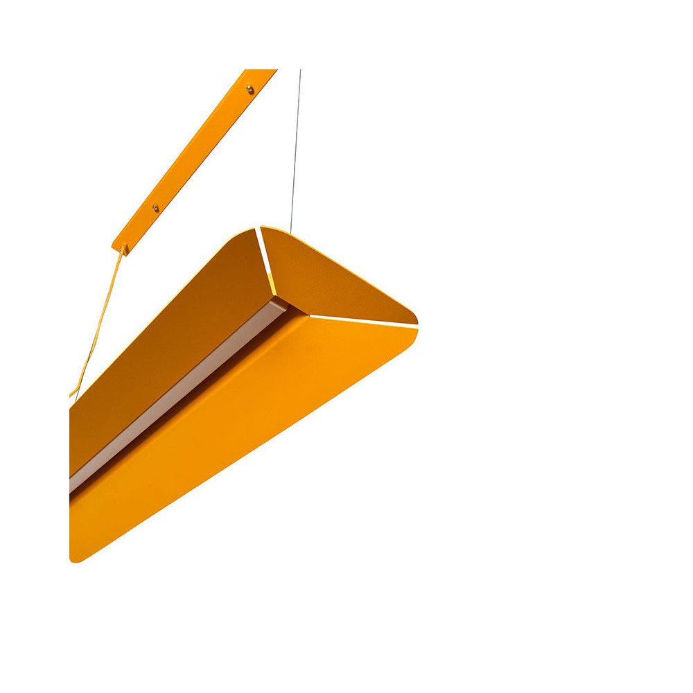 Lampan är tillverkad av pulverlackerad metall, vilket gör den inte bara hållbar utan också estetiskt raffinerad. Den interna ljuskällan är en integrerad 14,4W LED-panel (CRI 90), som finns i två färgtemperaturer - 3000K eller 4000K - vilket gör att den inre atmosfären kan anpassas efter användarens behov. Den slimmade formen mäter: 100 x 25 x 8 cm är upphängd i tunna stålvajrar, vilket ytterligare understryker dess lätta och fina karaktär.